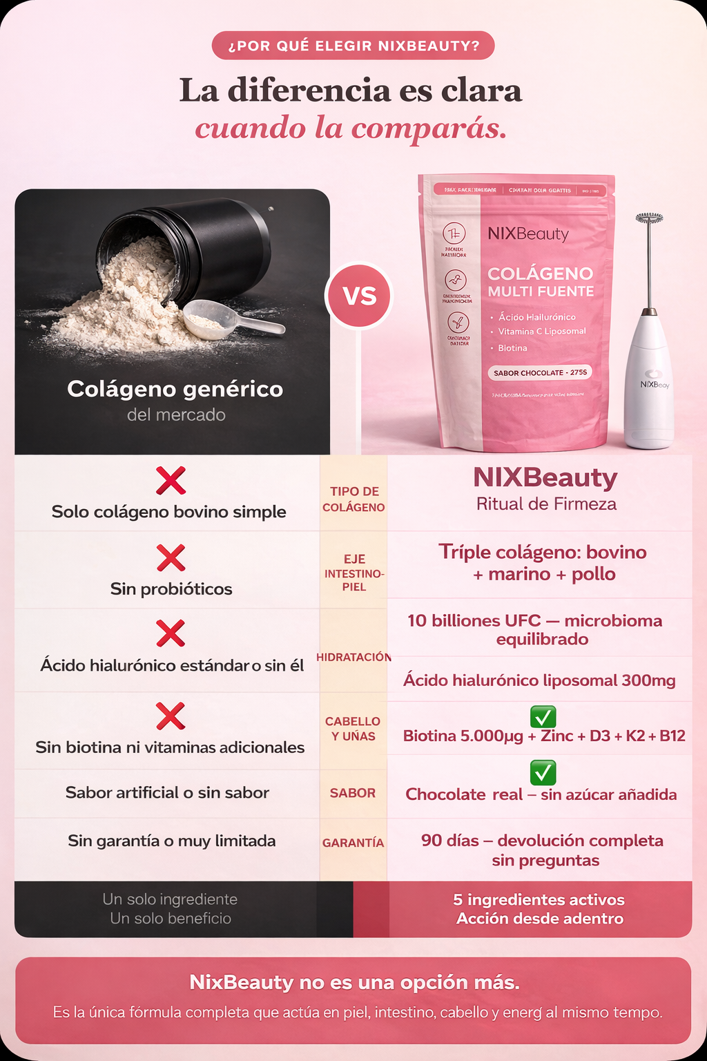 La mayoría de los colágenos del mercado son bovino simple. El Ritual NixBeauty combina 3 tipos de colágeno + probióticos + biotina + vitaminas D3, K2 y B12 — actuando en 5 frentes al mismo tiempo.